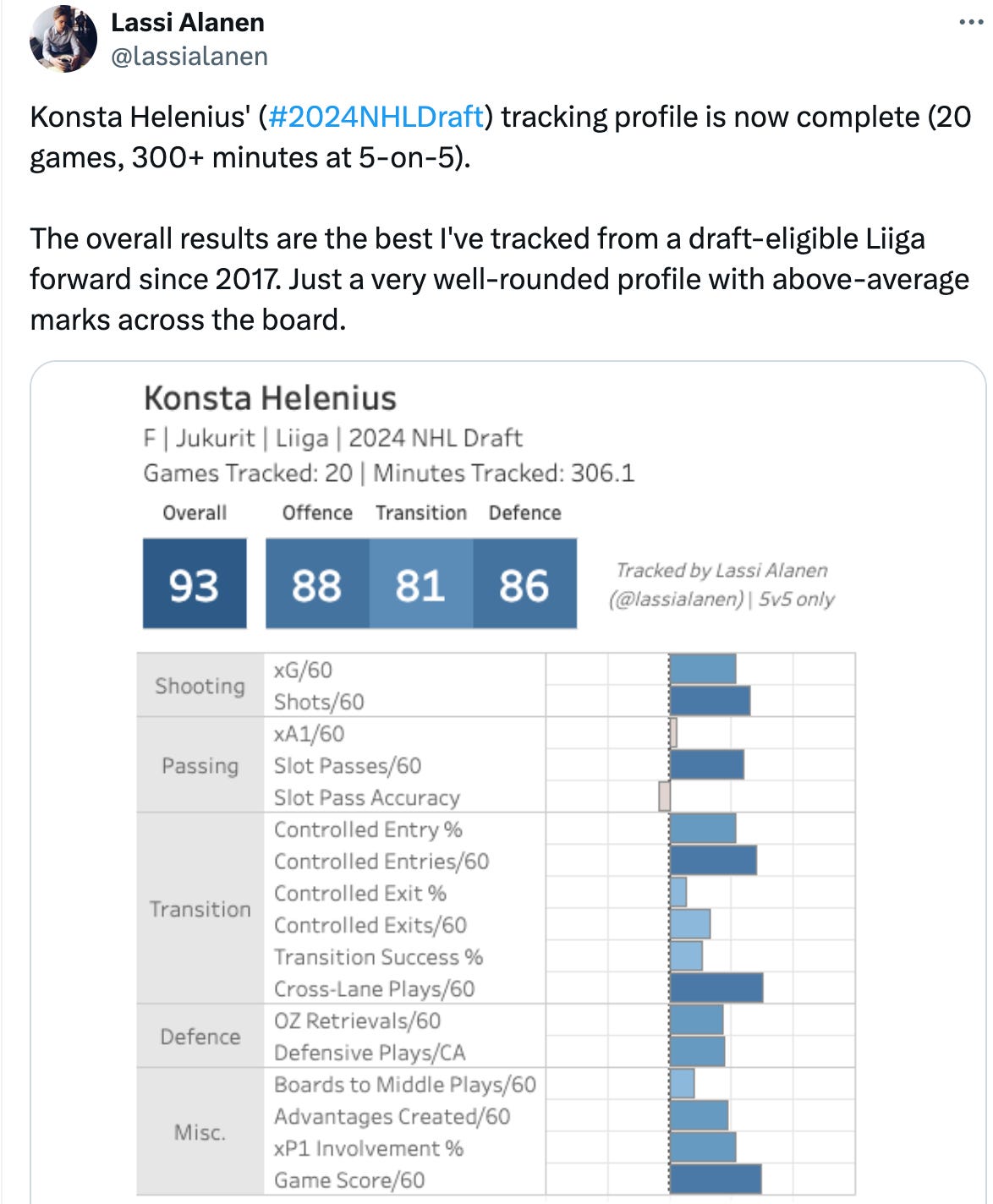 Helenius also excels in transition. He's not the quickest skater, but his smarts help him move the puck well. Per Lassi Alanen's tracked data, there wasn't an area where Helenius particularly struggled in transition this past season in the Liiga: