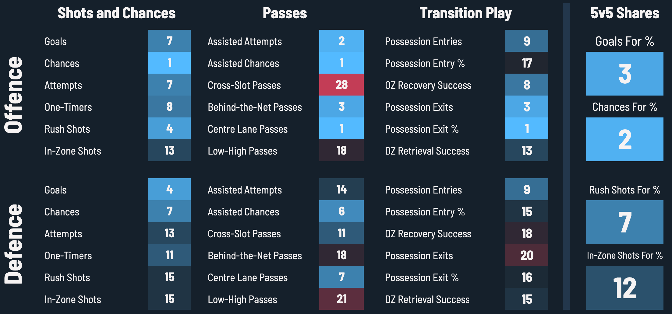 However, there was a bit of a step back for the Maple Leafs' defense. Their in-zone defense was still solid, but they weren't as effective at defending the rush or denying teams from moving the puck through the neutral zone in transition. Their 53.54 xG% was still top 10 in the league, but their defense was a reason they took a small step back.